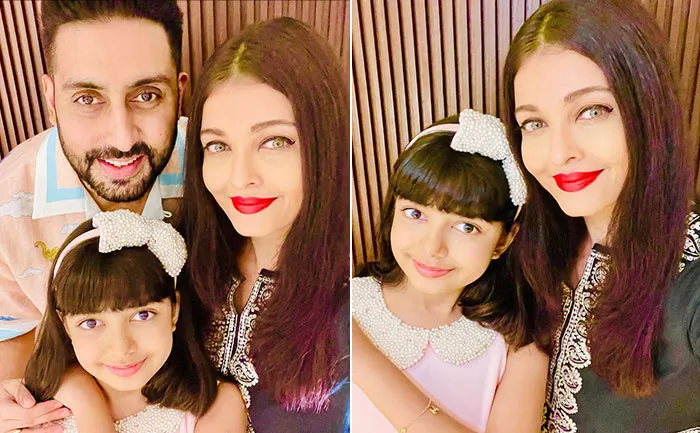 In the photos, Aishwarya looks absolutely gorgeous as she dons a black kurta with an embroidered neckline, the birthday girl is seen wearing a pink frock with a pear-beaded Peter-Pan collar detailing, paired with a bow hairband, and Abhishek wore an animal motif linen half-sleeved shirt.