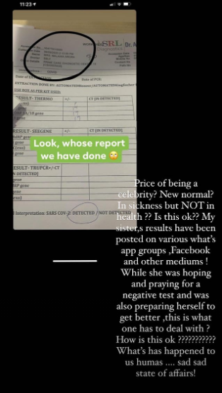 Amrita Arora, took to her Instagram handle to slam the people for sharing her sister’s reports on social media, she wrote: “Price of being a celebrity? New normal? In sickness but not in health? Is this ok? My sister’s results have been posted on various WhatsApp groups, Facebook and other mediums! While she was hoping and praying for a negative test and was also preparing herself to get better this is what one has to deal with? How is this ok????????? What’s has happened to us humans sad sad state of affairs.”