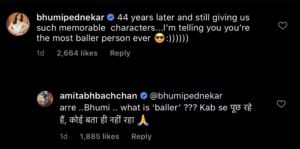 However, this is the second time Bhumi called Big B ‘baller’, and the veteran actor was not able to understand what she meant back then, too, he replied to her comment and said, “Arre…Bhumi…what is ‘baller’??? Kab se pooch rahe hai, koi bata hi nahi raha (I have been asking for a long time but no one is answering me).”