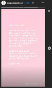 The ‘Chhapaak’ actress took to her Instagram stories and shared the picture of Ananya Panday and penned down some heartfelt lines for her. “My Baby girl…words cannot describe the love I feel for you. And even though we’ve just met, I feel proud to see the smart, sensitive and witty girl you’ve grown into! Wishing you good health, happiness, superstardom and truckloads of biscoff my love! I love you….@ananyapanday,” shared Deepika in her Insta stories.