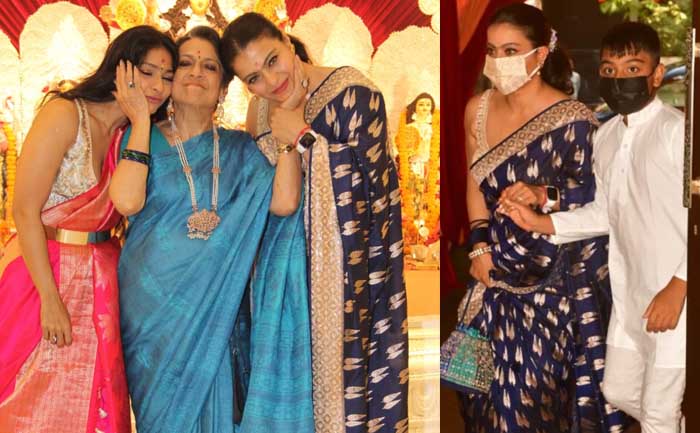 Actress Kajol is celebrating Durga Puja with her family. After leaving fans floored with her pink avatar on Tuesday where she was seen reuniting with her uncles. The actress once again left us mesmerized as she attended the family Durga Puja on Wednesday with her son Yug. She was looking stunning in a classic Blue traditional saree, whereas Yug was dressed in a white traditional Kurta Pyjama.