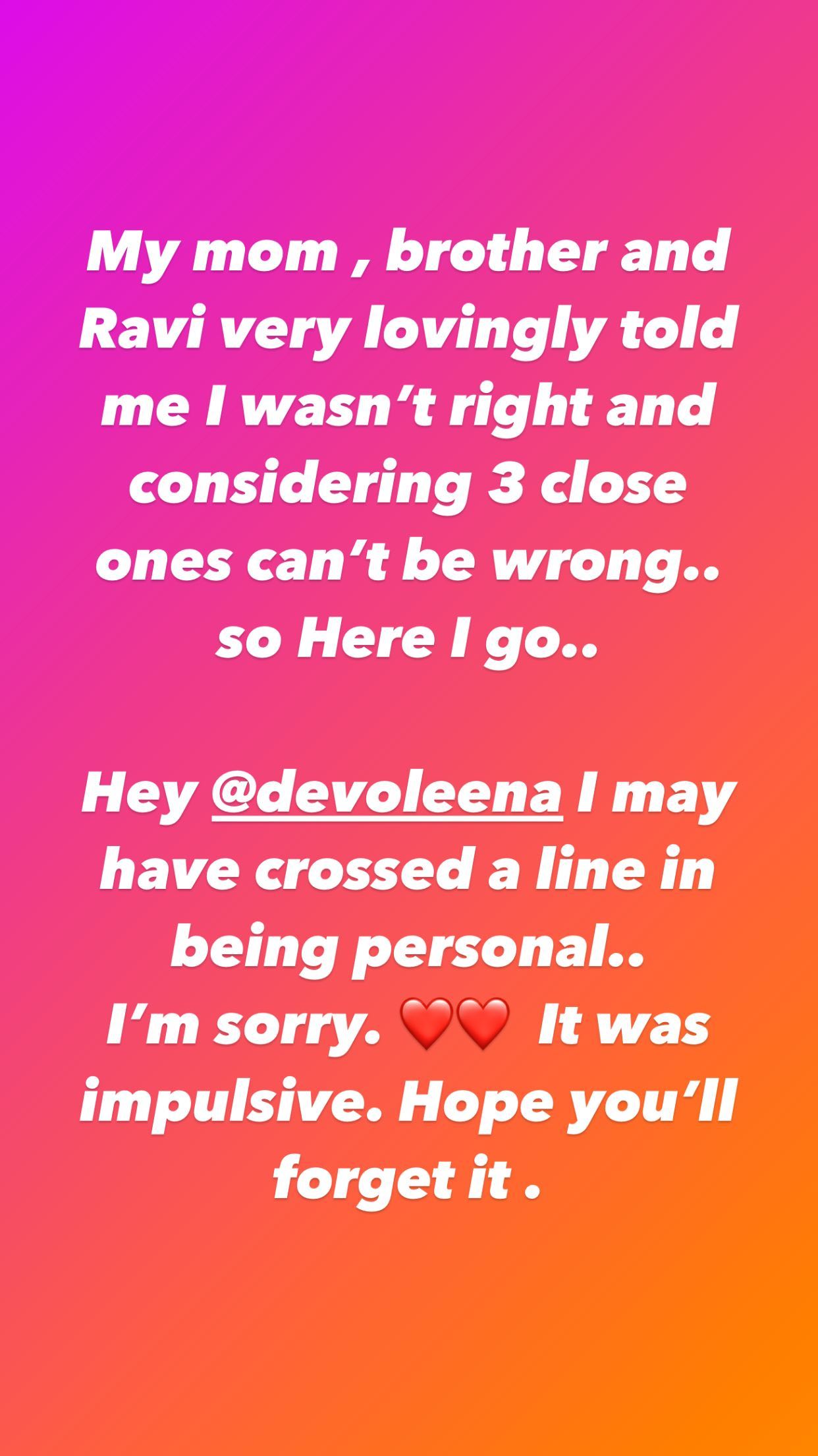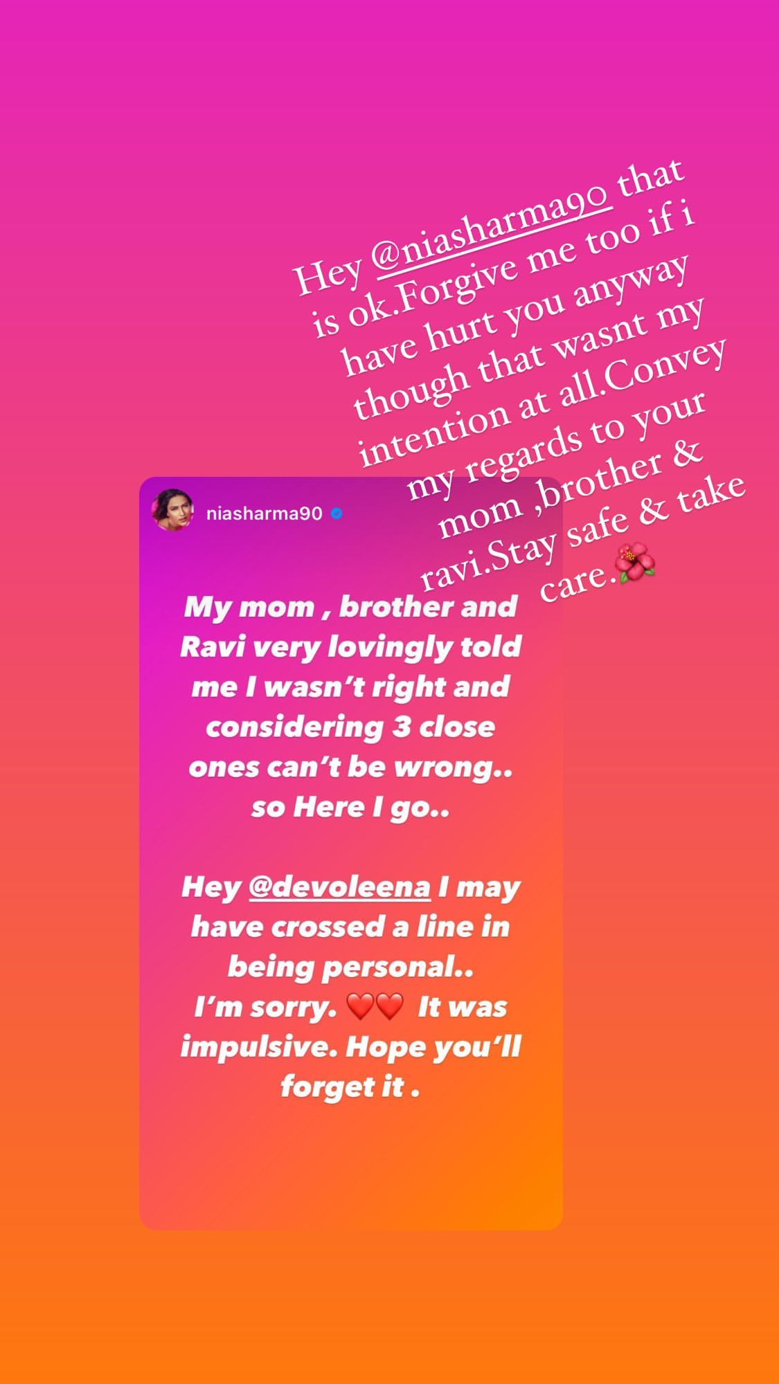 Nia Sharma took to her Instagram stories and issued an apology. Her note read, “My mom, brother and Ravi very lovingly told me I wasn’t right and considering 3 close ones can’t be wrong.. so here I go.. Hey @devoleena I may have crossed the line in being personal.. I’m sorry. It was impulsive. Hope you’ll forget it (sic).”