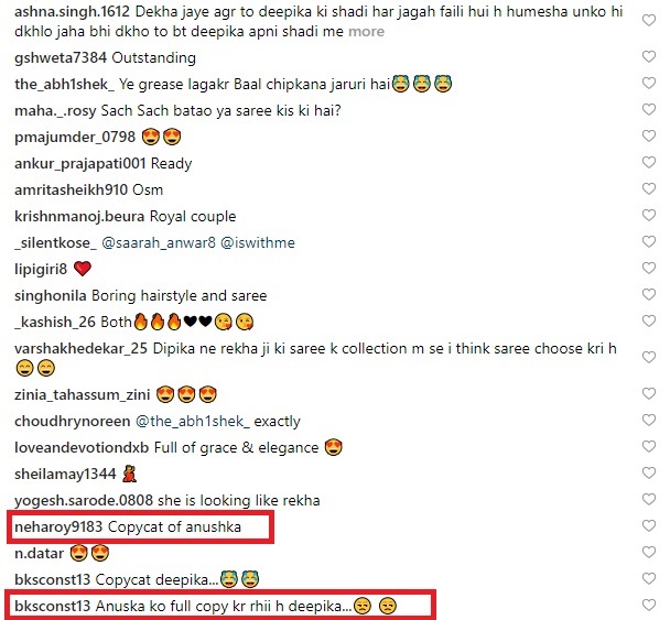 Just before the event both the actors shared the first pictures of their looks for the reception and while both looked regal in their attires, fans found some uncanny resemblance in Deepika’s reception looks with that Anushka Sharma’s looks for her reception in Delhi last year.