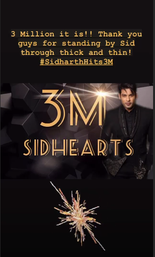 Sidharth Shukla’s team acknowledged the fans and followers for supporting him and took to the Instagram story and wrote, “3 million it is!! Thank you guys for standing by Sid through thick and thin #SidharthHits3M.”