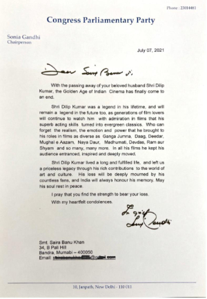 Dilip Kumar demise: Sonia Gandhi offers letter of condolence to Saira Banu