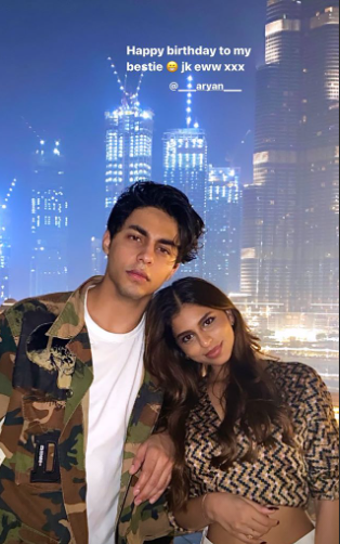 Suhana shared a photo on her Instagram story with Aryan, which is from their recent Dubai visit, against the backdrop of Burj Khalifa, where the family went to the Indian Premier League, to support their team Kolkata Knight Riders, she wrote on the photo, “Happy birthday to my bestie jk eww xxx @aryan.”
