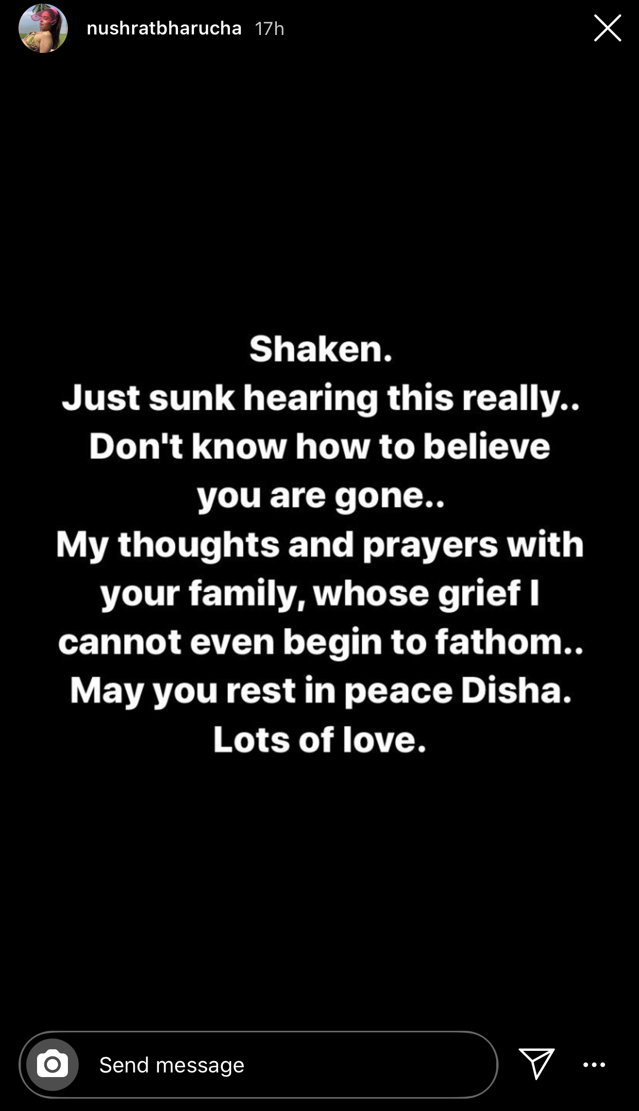 Nushrat Bharucha also expressed her shock at the sudden demise of Disha Salian, “Shaken. Just sunk hearing this really.. Don’t know how to believe you are gone..My thoughts and prayers with your family, whose grief I cannot even begin to fathom.. May you rest in peace Disha. Lots of love,” she wrote.