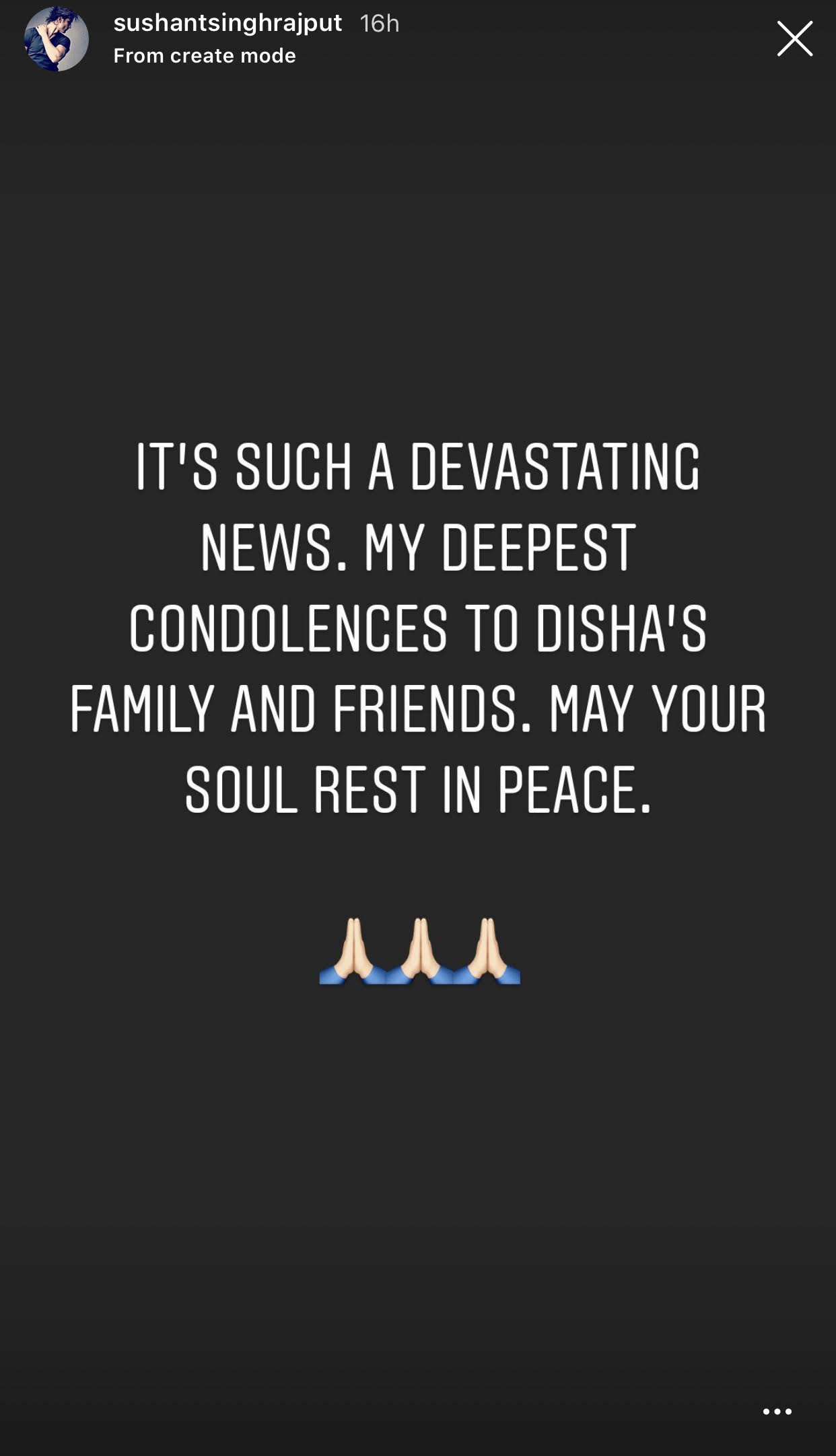 Sushant Singh Rajput took to his Instagram stories and wrote, “It’s such devastating news. My deepest condolences to Disha’s family and friends. May your soul rest in peace.”