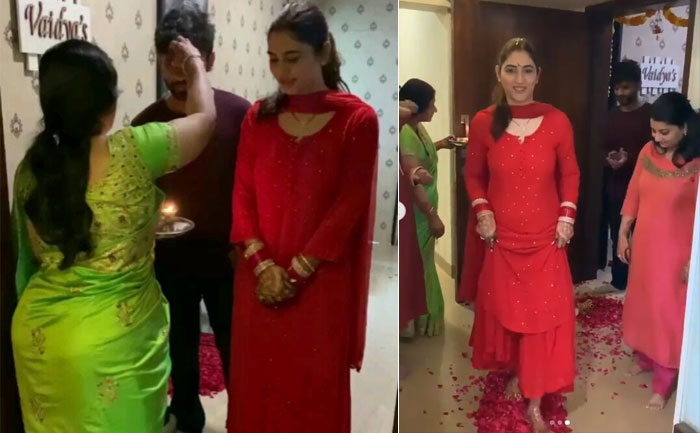 Disha Parmar receives a warm welcome at the 'Graha Pravesh' ceremony by the family members…