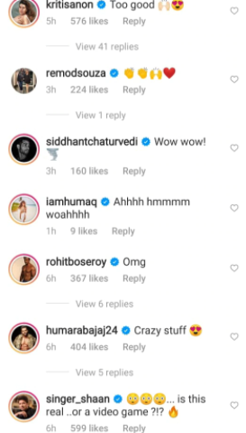 Tiger’s mother, Ayesha Shroff, wrote, “Wowwwwwwwzaaaaa!” with several clap and heart emojis. His sister Krishna Shroff commented, “BRUH, what?” Kriti Sanon, who made her Bollywood debut opposite Tiger in Heropanti, wrote, “Too good.” Krishna was completely blown away by the video. She wrote, “BRUH..WHAT??” with a shocked face exploding head emoji.