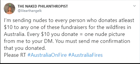 “I’m sending nudes to every person who donates at least $10 to any one of these fundraisers for the wildfires in Australia. Every $10 you donate = one nude picture from me to your DM. You must send me confirmation that you donated.”